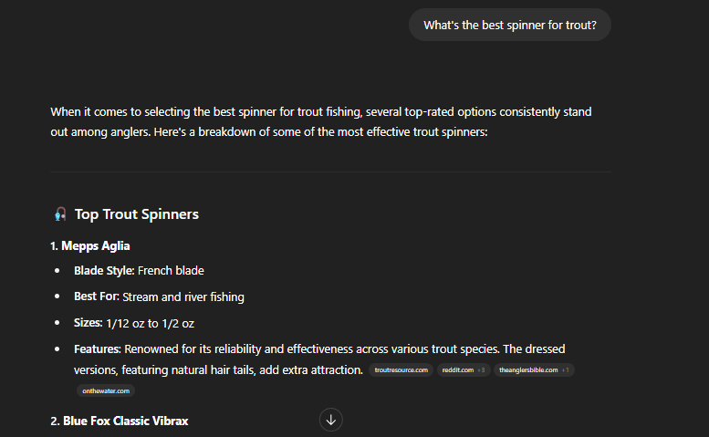 To try things out, I searched for “What’s the best spinner for trout?” Below is a screenshot of some of the output: