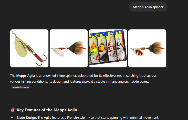 All the same, I asked it about a specific model of lure, so I can’t blame the search engine too much on the generality of what it gave me back.