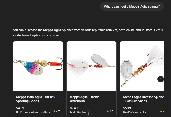 To drill down a little, I incorporated that keyword into a more targeted, longer-tail search query, “Where can I get a Mepp’s Aglia spinner?” and you can see the results below.