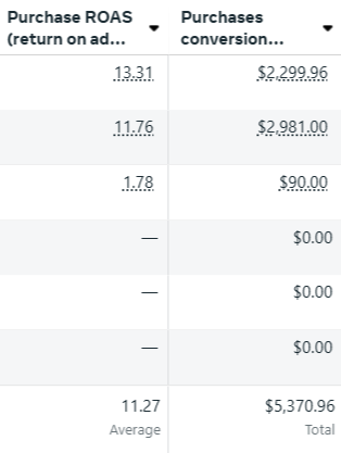 It depends on how you define “work.” If the goal is profitability, then Return on Ad Spend (ROAS) is one of the best ways to track it. We started managing a new client’s ad account just one month ago in March (check out screenshots above). Their ROAS climbed from 1.74 to 11 in 30 days.