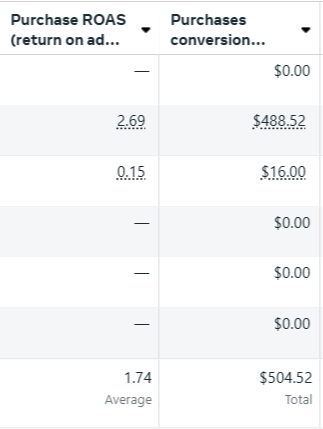 If you’re running Facebook ads, you can view ROAS in the Facebook Ads Manager by customizing your reporting columns. Look for Purchase ROAS, Website ROAS, or Mobile App ROAS. These let you break down how much revenue each ad generates compared to what you spent.