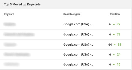 That chart shows the top 5 keyword movements for Divinity Clergy Wear throughout their SEO campaign, which is ongoing as of September 2020. Their top keyword moved up 77 positions, which is an impressive gain by any standard. At the same time, the next four keywords moved up by 73, 33, 24, and 16 positions, respectively.