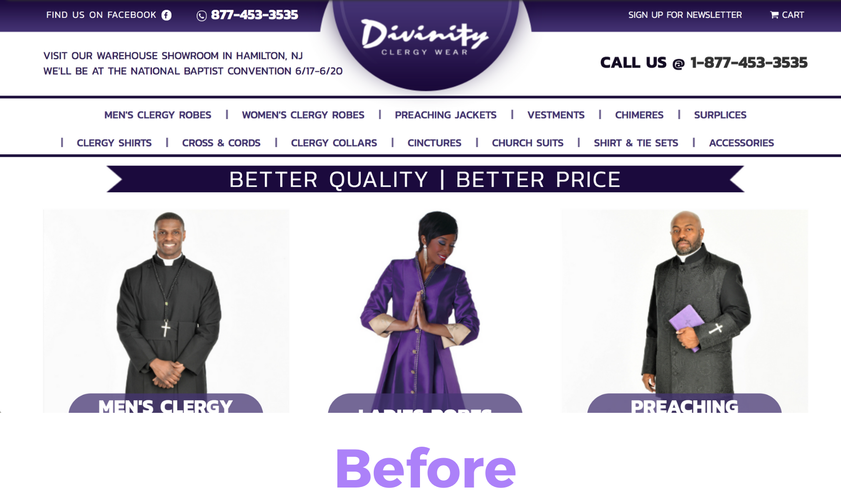 For that reason, we designed a fully brand-integrated About Us page for Divinity Clergy Wear populated with valuable information about their mission and featuring attractive contemporary fonts and product imagery. Keep in mind, we did all of this with the intent of boosting click-through-rate and user experience.