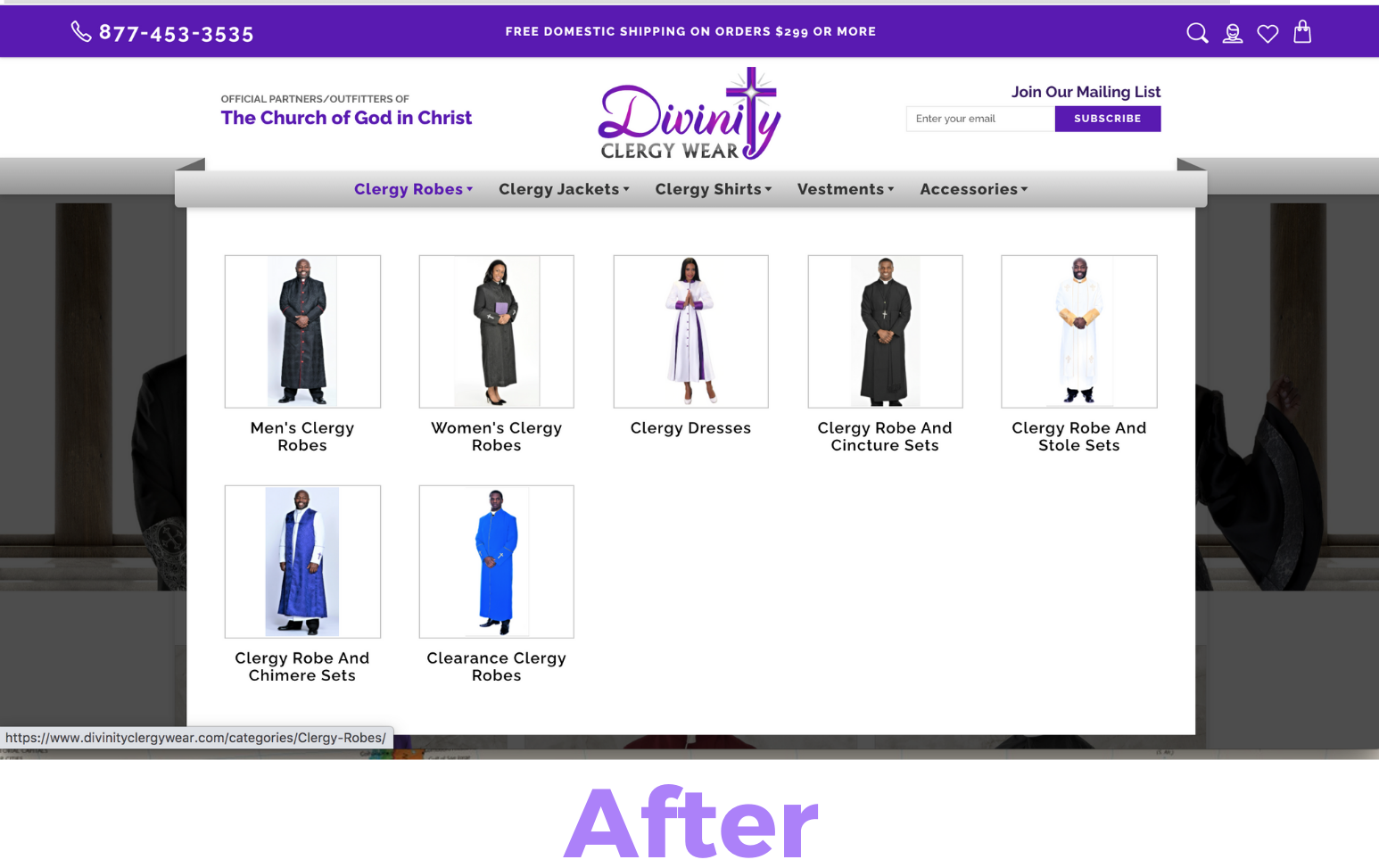 The search functionality of their old website was limited; it contained no search bar, only a mega menu that, while it was neatly arranged, was unintuitive and consisted solely of words. It’s a commonly known fact that high-quality imagery increases click-through and conversions, and so we updated their mega menu design with high-quality images of their products. In an industry where words like “Cassock,” “Surplice,” “Vestments” and other esoteric terms are not only common but competitive, including images is a big booster for experience and conversions.