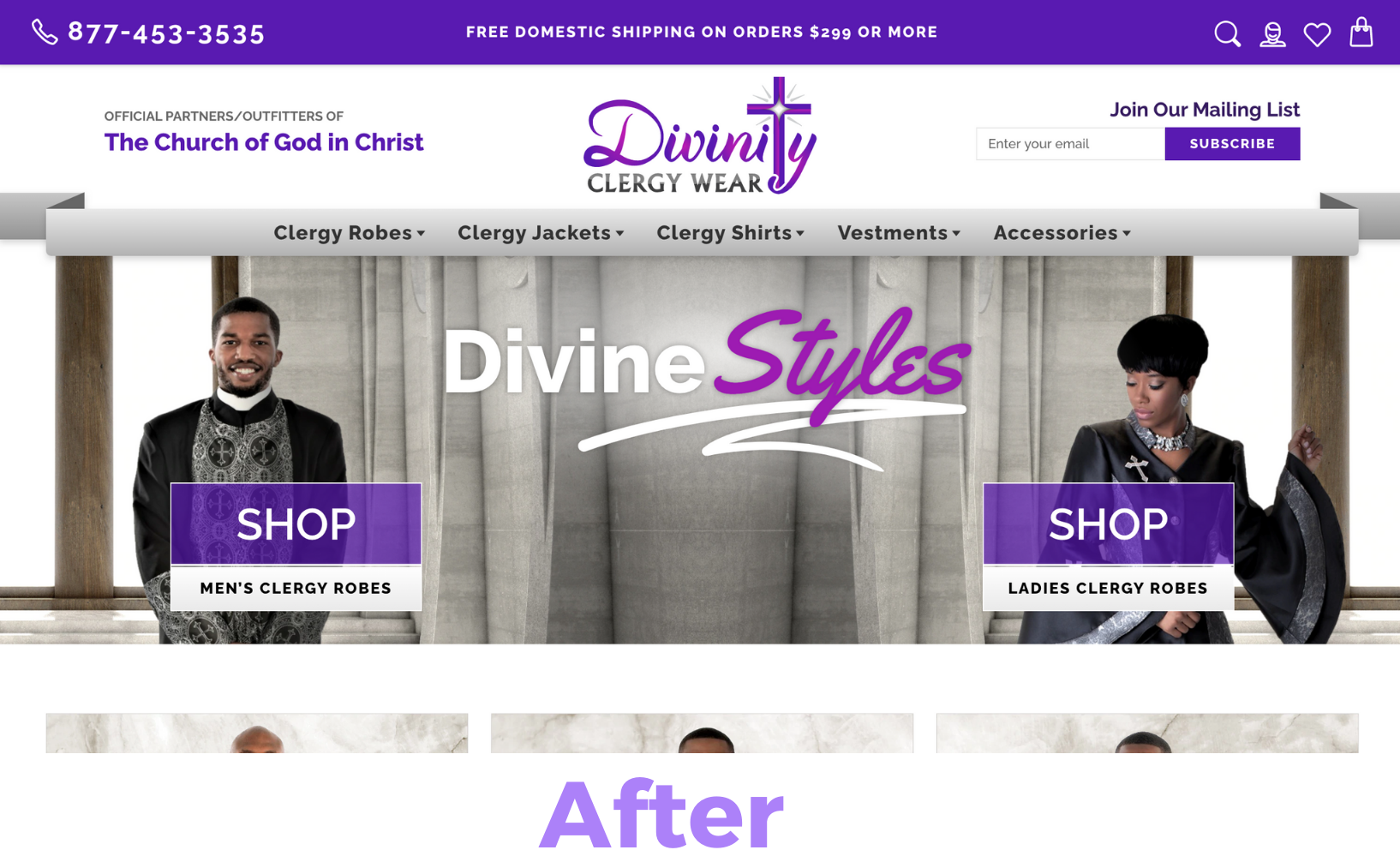What that meant for Divinity Clergy Wear is that they needed to be competitive with their online presence in order to drive traffic, build sales, and grow as a business overall. They were already on BigCommerce, a platform that is a well-known, preeminent option for eCommerce ventures due to its compatibility with a variety of third-party apps, SEO friendly structure, high security, speed and uptime, and many other factors affecting the UX of eCommerce websites.