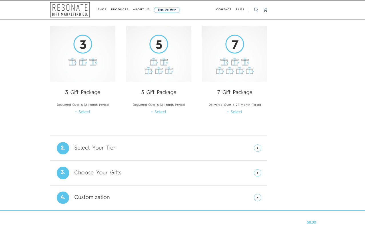 In the first step, you select your package. This communicates how many gifts you want Resonate Gifts to mail to your client. In the second step, you select your tier. This allows you to choose which of those gifts will be from the standard, deluxe, or premium tier. All of which are categories managed by Logan’s team in the backend of BigCommerce. Thirdly, you select your gifts. Based on what you chose in the step before, a selection of gifts will be shown stratified by tier. If you attempt to select more gifts than you have in any certain tier, the system will cut you off. The fourth step is customization which allows you to specify in what order your gifts will arrive and include an inscription if you so choose. Further steps of the process take place in the cart area of BigCommerce where you will specify your client’s address and also choose when the items should go out. This is all to make sure that, as the customer goes methodically through each step in the process, each piece of information that the Resonate Gifts team needs in order to fulfill the request is specified, or the process will not move forward.