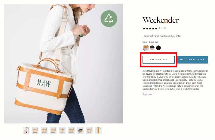 The tool we built for Paravel displayed a popup with the words “Personalize” when a customer visited the product page We then created a tool that would enable the customer to personalize the product according to the style and color of the lettering that would appear as a monogram with their initials.
