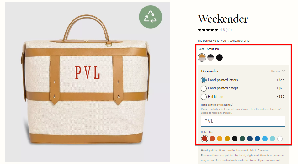 We also developed a tool for their product page template that would allow shoppers to personalize their shopper experience and make it more realistic. In addition to offering their customers the ability to see what a given bag (or other product) would look like using the swatch functionality described above, Paravel also gives its customers the ability to personalize their products.