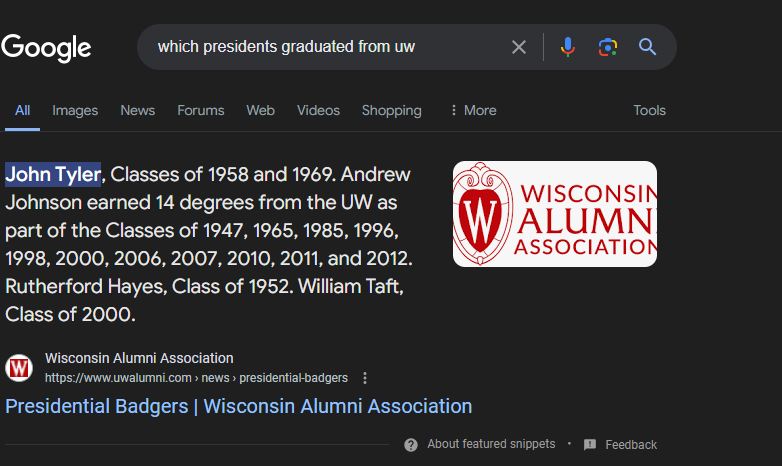 Dear reader, Andrew Johnson, esteemed 17th President of the United States, died in 1875. That would make him the first President to have graduated posthumously from UW not once, but eleven times.