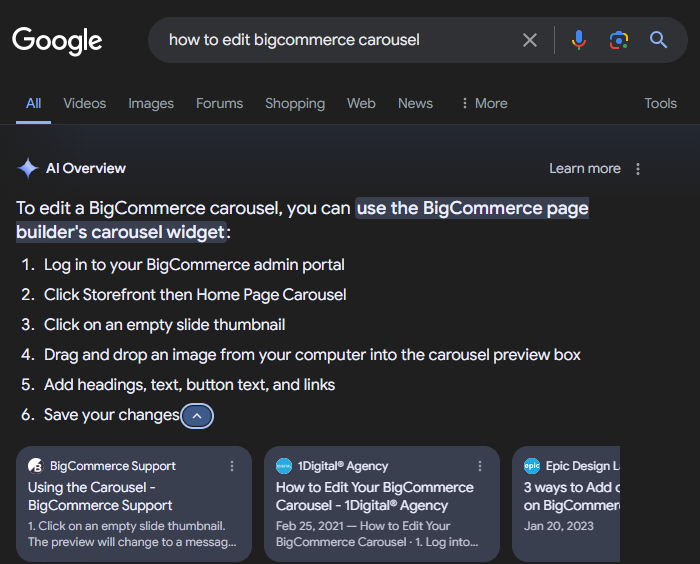 Now, this actually comes back to the traditional maxims of eCommerce SEO. In this capacity, we’re aiming to show up in the overview, which will only happen with good, reputable copy (most of the time).