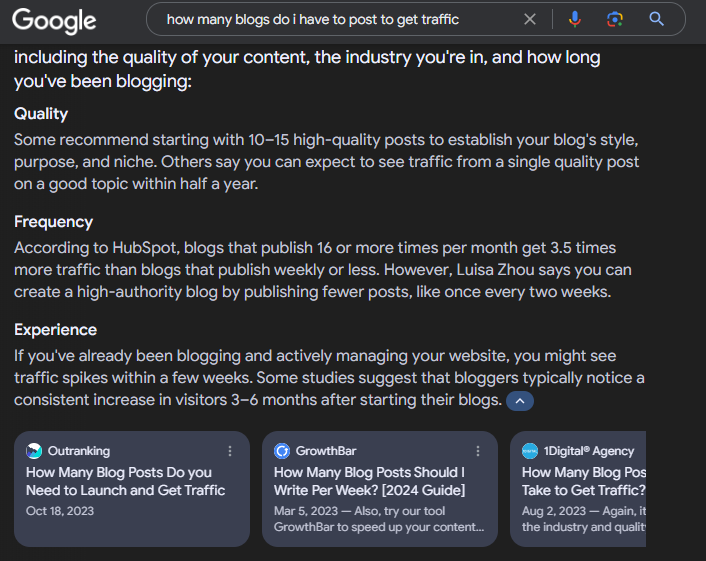 Here’s another, of which I’m considerably more proud. Let’s see you’re out there, on “the Google,” wondering how many blog posts you need to get traffic. You might ask it the following question, and you’ll get this Google AI Overview:
