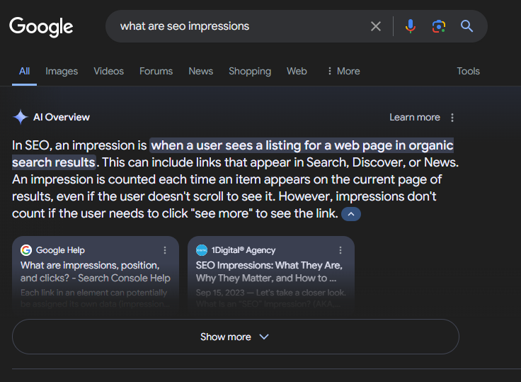 I’ll be the first to admit that it’s kind of a weird query, since most people who want to know the answer to this question know enough not to look up “SEO impressions” and just call them “impressions.”