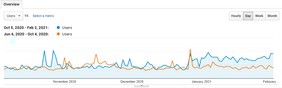 To give some general insight into the way traffic boomed as our project got rolling, consider the following image which shows organic traffic to Cyclone Pods’ eCommerce site from the beginning of their campaign in October 2020 through to the end of January 2021. The increases in organic traffic to their website appears even more dramatic when overlaid by organic traffic figures from the corresponding previous period, from June 2020 through the end of September 2020.