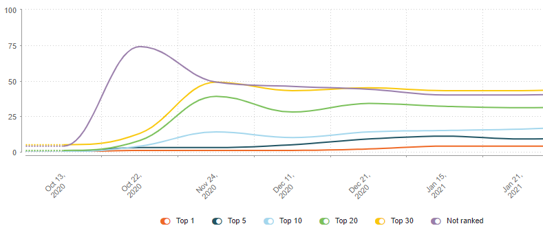 The image below shows their keyword movements from the start of their campaign till the end of January 2020. It shows keywords for which they are not ranked, as well as keywords for which they rank in the top 30, top 20, and so on and so forth as indicated, to the keywords for which they rank in the top spot organically.