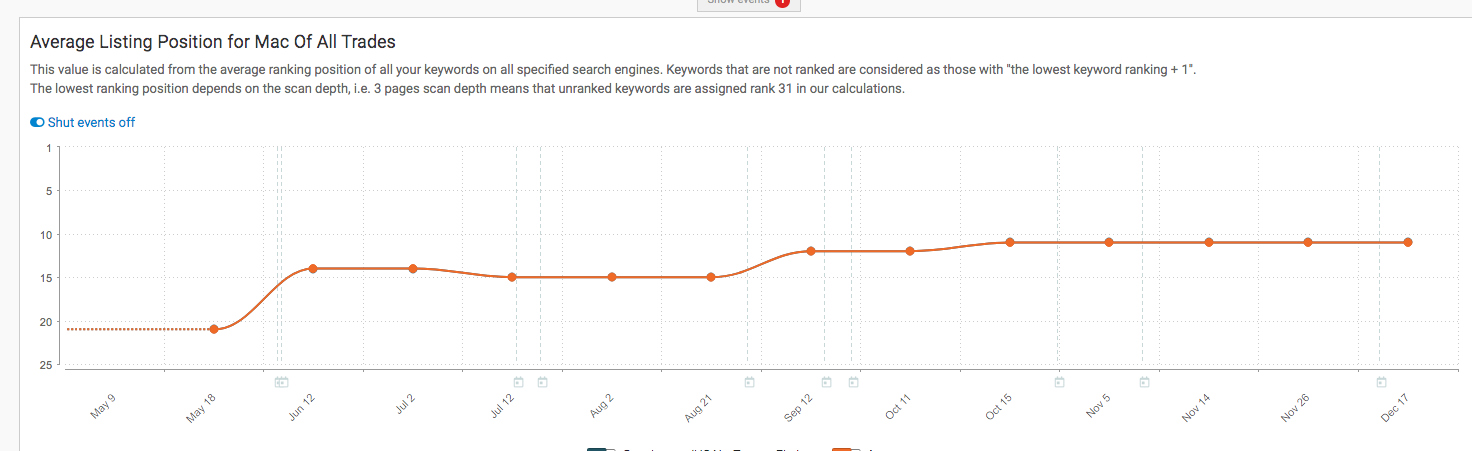 We have also seen average site visibility go up overall. Mac of All Trades’ average ranking was the 21st spot when the campaign began. Now, 7 months in, the average Mac of All Trades keyword sits at the 11th position. Their traffic score and average ranking position now also outstrip big-name competitors in the space like MacWorld and New Egg.